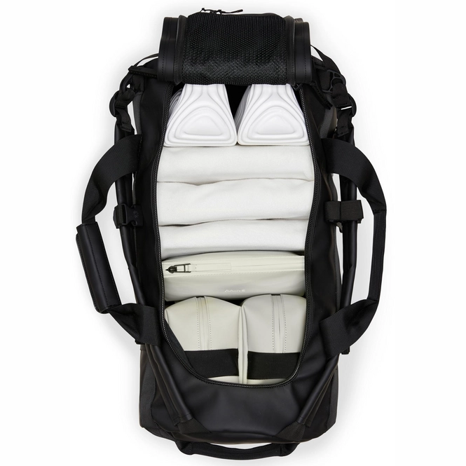 Die Reisetasche Rains Unisex Duffel Bag Small Black ist das perfekte Accessoire für Reisen und Wochenendausflüge. Die Tasche aus 100% Polyester ist robust und wasserabweisend, um Ihre Sachen bei jedem Wetter zu schützen. Mit einem Fassungsvermögen von 34L bietet die Tasche ausreichend Platz für Ihre Kleidung und Reiseutensilien. Die U-förmige Klappe mit Reißverschluss ermöglicht einen einfachen Zugang zum Hauptfach, während das seitliche Reißverschlussfach und das interne Netzfach zusätzliche Organisationsoptionen bieten. Die Tasche verfügt auch über zwei Mesh-Taschen mit Reißverschluss unter der Klappe, eine verstärkte Basis und Kompressionsbänder an den Seiten. Mit gepolsterten verstellbaren Schultergurten und gepolsterten Griffen ist diese Tasche für Damen und Herren gleichermaßen geeignet.